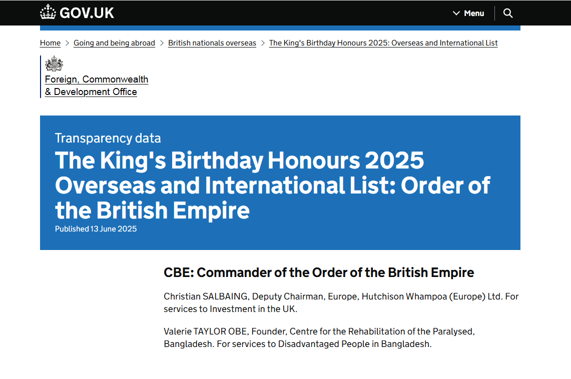 CRP Founder Dr. Valerie Taylor has been awarded the Commander of the Order of the British Empire (CBE) on The King's Birthday Honours 2025 for her services to disadvantaged people in Bangladesh.
